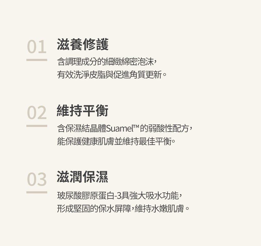 含植萃精華、玻尿酸膠原蛋白等成分,以弱酸性的綿密泡沫溫和清潔,呵護身體肌膚。