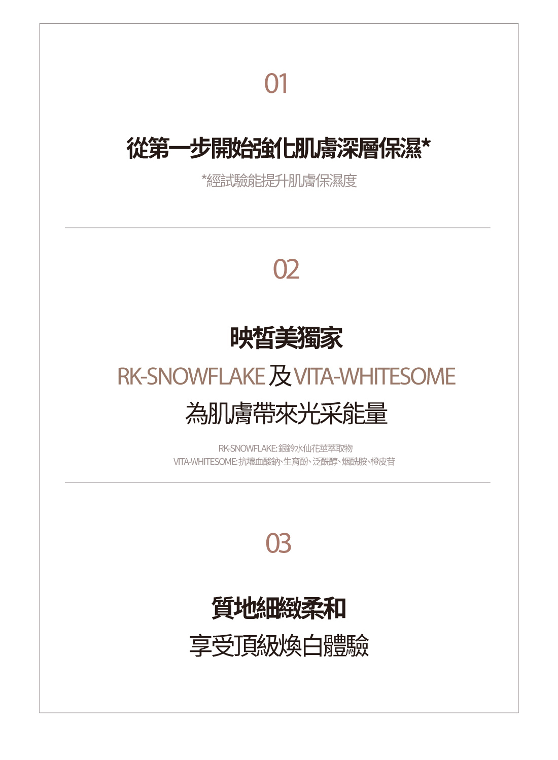 讓肌膚煥發光采的多效能精華成分,微分子成分更易吸收,打造亮白晶透美肌。