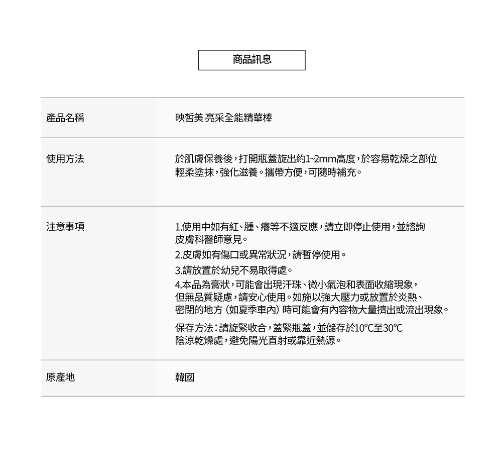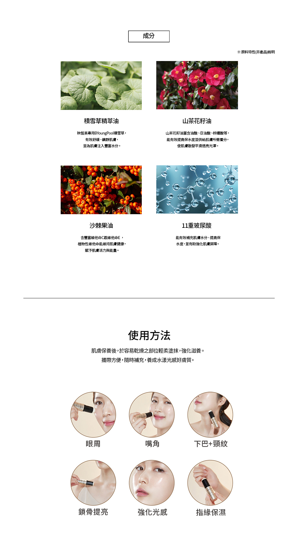 含豐富植萃成分,攜帶方便,可隨時補充,能立即提供肌膚養分與水分,一抹呈現光澤水感。